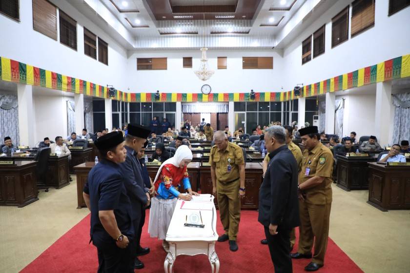 Rapat paripurna ditutup dengan penandatanganan berita acara pengesahan oleh Ketua DPRD Rohul sebagai tanda sahnya Perda APBD Perubahan 2025. (Galeri Foto/Des)