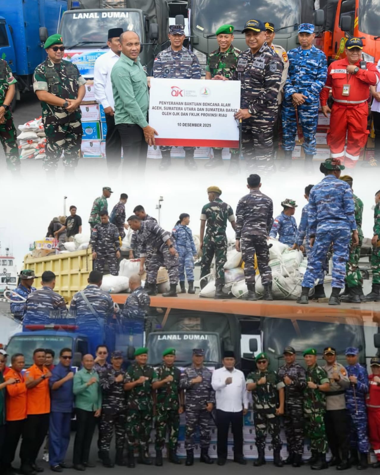 Dumai – PT Bank Riau Kepri Syariah (Perseroda), sebagai anggota Forum Komunikasi Industri Jasa Keuangan (FKIJK) Riau, bersama Otoritas Jasa Keuangan (OJK) Provinsi Riau, menyalurkan bantuan logistik bagi korban banjir bandang di Kabupaten Aceh Tamiang. Penyerahan bantuan  bertempat di Dermaga Pelabuhan Pangkalan TNI AL Dumai, pada Rabu (10/12/2025).